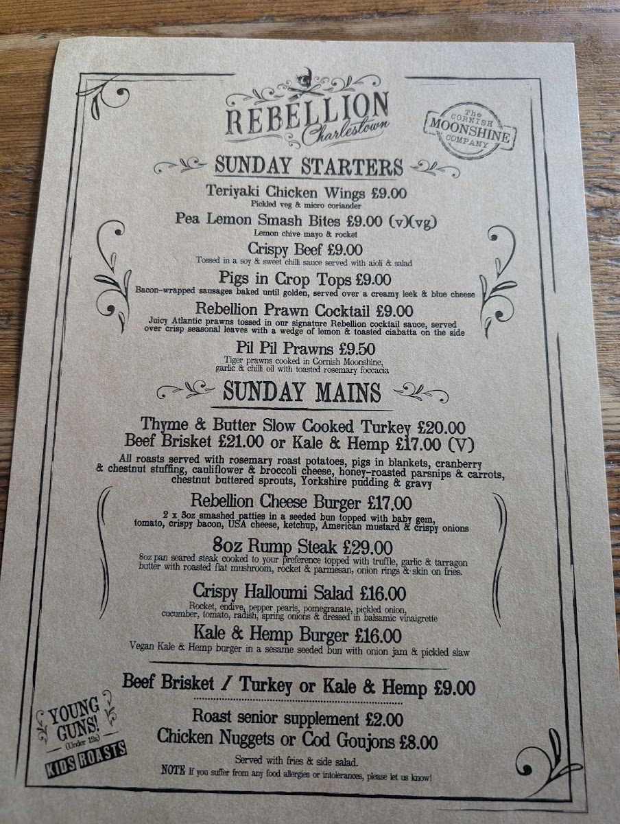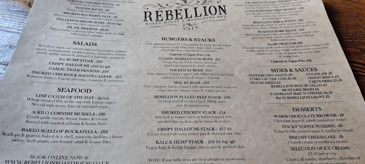 When you step into Rebellion Roast House Menu, you know you're in for something special. Nestled on Quay Rd in Charlestown, Saint Austell, this cozy spot serves up more than just your typical meal. The menu brings together bold flavors and a laid-back vibe, offering a range of mouthwatering dishes that are as satisfying as they are comforting. Whether you're craving a hearty roast, something fresh from the sea, or a flavorful vegetarian option, there's something here to hit the spot. With locally sourced ingredients and a strong emphasis on fresh, quality flavors, each dish has been crafted with care and creativity. Perfect for any occasion, Rebellion Roast House Menu promises an experience that will have you coming back for more. So sit back, relax, and let the flavors do the talking.